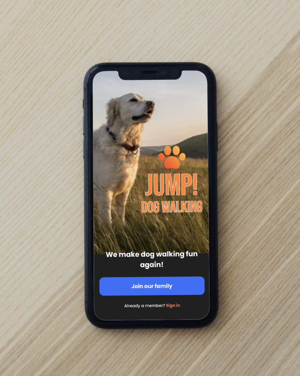Jump! is a mobile application designed to connect dog owners with verified walkers, allowing seamless scheduling, real-time tracking, and secure payments. The app focuses on ease of use, trust, and safety to provide a hassle-free experience.